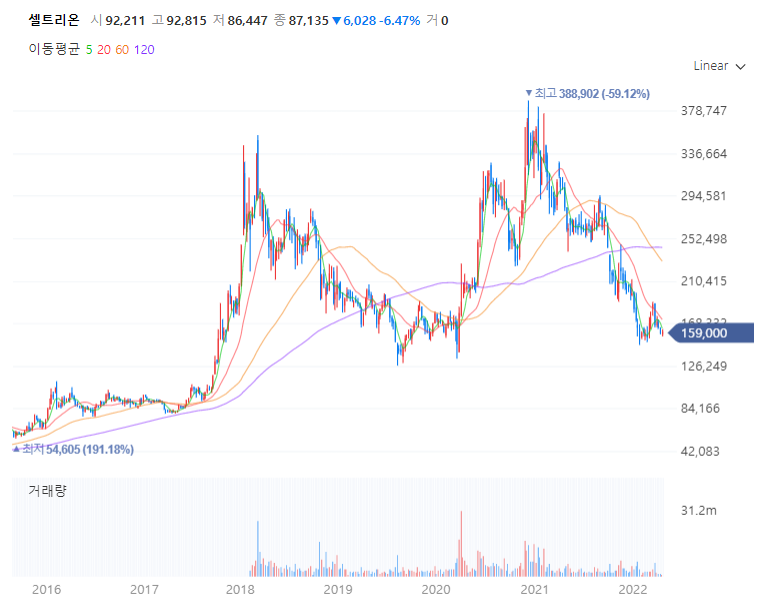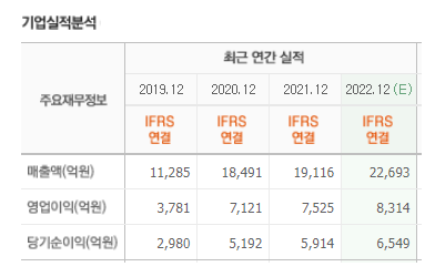 재무재표를 통하여 기업실적을 확인해야 합니다. 여러가지 지표들이 있는데, 매출액과 영업이익의 흐름은 분기별로 체크를 하는 것이 좋습니다. 셀트리온 연간 주가 실적 (매출, 영업이익)을 보면, 주가가 고점이라고 생각될수도 있으나, 매출액과 영업이익이 지속적으로 증가하고 있고, 특히 2022년의 매출액, 영업이익이 전년도보다 상승할 것으로 예상하고 있기 때문에, 상승여력이 남아 있는 것으로 생각을 해볼 수 있습니다.