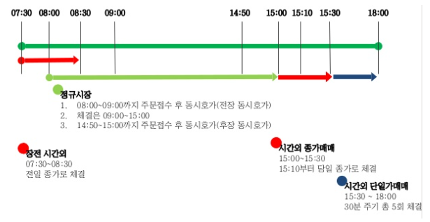 장시작 전에는 8:30-8:40에 진행되고 전날 종가로 거래가 이루어 집니다. 장마감 후에는 15:40-16:00 사이에 진행이 되고, 그날 종가로 거래가 이루어집니다. 다른 가격으로는 거래되지 않습니다.