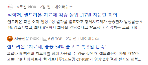 포털사이트 뉴스탭에서 해당 종목을 검색해보고, 어떠한 뉴스가 나오고 있는지 파악합니다. 예를들어 셀트리온의 경우는 식약처에서 치료제 검증에 돌입한 단계이며, 해당 치료제로 중증이 줄었다는 기사가 나오고 회복시간도 향상되었다는 소식이 있었습니다. 이럴 경우는 해당 기업 주가를 지속적으로 보고 있다가 여러 이슈들로 인해 조정이 왔을 때, 적금처럼 사둔다면 좋은 결과를 가져올 것입니다.