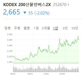 선물 ETF는 코스피의 선물지수를 추종하는 ETF를 말합니다. 이 중 'Kodex 200선물인버스2x' 라는 ETF 종목을 예로 들어보겠습니다. 코스피200을 -2배로 추종하는 레버리지 ETF인데요. 코스피200에 편입되어 있는 주식을 기초로 지수가 적용되어 있는 상품입니다.
