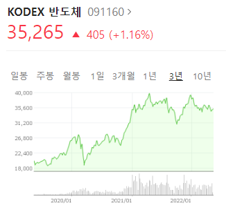 예를들면 올해는 반도체가 강세일 것 같다고 생각이 들면, 다양한 반도체 기업들을 모두 분석하고 매매할 2-3개 기업을 골라서 투자를 해야 하는데 ETF의 경우는 그럴 필요없이 반도체 기업들중 좋은기업들을 모아놓은 'KODEX반도체' ETF를 매수하면 됩니다. 등락이 조금씩 있기는 하지만 최근 3년간 반도체가 성장하였기 때문에 꾸준하게 성장하고 있는 모습입니다.