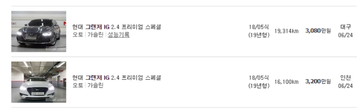 위 그림은 그랜저 IG 2.4의 2018년 5월 연식의 차량입니다. 만일 내 차가 18,000km 정도 주행을 했다고 가정한다면, 약 3,100만원 내외로 내차팔때 가격이 형성되겠구나라고 생각하신다음, 여기서 200만원 정도 내리면, 내차 중고팔때 대략적인 가격을 산출해 볼 수 있습니다.